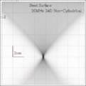 ここでは一般的2Bガス管の探傷の模擬をします。通常の探触子のシューは平面ですが、パイプの上では不安定なのでR加工して使います。各パイプの入射点で入射角が一定となる様な振動子面にすると、SNが良くなります。先ずレイ法による等角入射振動子と平面振動子で、シューをパイプ曲率に合わせた場合の模擬を示します。等角入射の振動子はパイプの度の面でも同じ角度で、屈折し、綺麗にスキップする事が判ります。平面振動子では色々な屈折角で入っていくのでスキップ距離色々で、渇巻からの反射の受信エコーも位相の異なる色々な音が合成され、感度が悪くなると予想されます。これを2次元FDTDでシミュレーションします。なお、下図の模擬はフリーソフトです。
