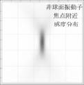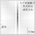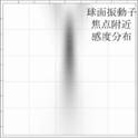 フォーカス探触子は焦点深度が短い欠点がります。感度とSNが落ちるが、振動子の中央を無くしリング状の振動子にすると、焦点深度は深くなります。次図は球面振動子、無収差面振動子、無収差面振動子の中央を面積で50%抜いた場合の焦点附近の感度分布です。ビーム幅は波長程度となっている。周波数は20MHz開口角45度(開口は90度)