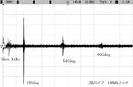 小さな縦波及び横波の音源をパイプ内に配置し、振動の方向を周方向とすると、以下の様になります。何れも臨界角相当のパイプ外面から同位相の波面が強く観測されます。等角横波90度の探触子では、パイプに付けた欠陥を2、3周程度の路程で観測できます(以下波形)。180度はパイプの探触子と反対側の位置の欠陥で、同時に180+360=540と180+720=900度にも観測できます。